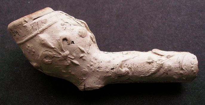 Pijpenkop: ± 1635 Model: Dubbelconisch Reliëfmerk: Lelie Verzameling: Hans van der Meulen lid van de PKN Opmerking: Barok versiering