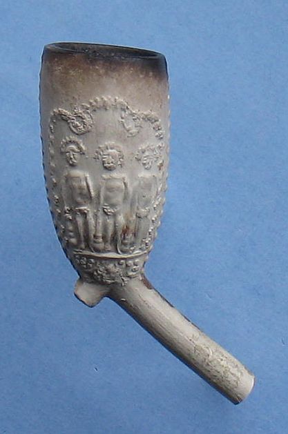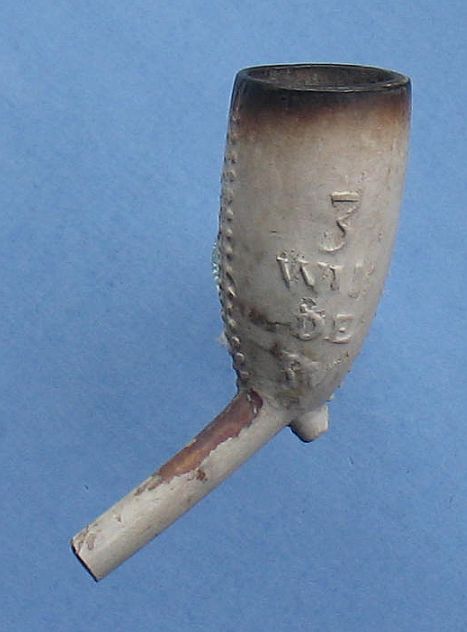 Pijpenkop: Midden 18e eeuw Model: Trechter met parelnaad Voorstelling links: Drie wildemannen Tekst rechts: 3 WILDE PV
