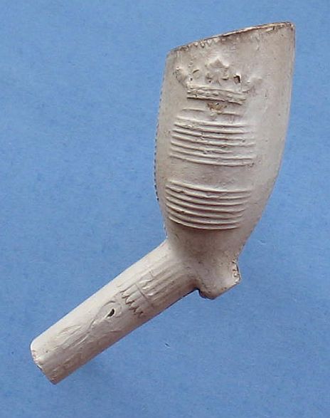 Pijpenkop: ± 1700 Vindplaats: Beerput Doelenstaat Delft Model: Trechter met parelnaad Versiering links: Hand met druiventros gekroond Versiering rechts: Wijnton gekroond