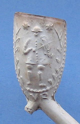 Pijpenkop: ± 1720 - 1740 Model: Trechter met parelnaad Versiering links: Speelman met de initialen VR Versiering rechts: Danser Pijpenmaker: Jan Cornelisz van Roon