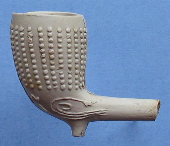 Pijpenkop: Vierde kwart 19e eeuw Vindplaats: Achterwillens Gouda Model: Shagpijp Versiering: Stippellijnen Schenking: Freek Mayenburg van Groenehartvertellingen
