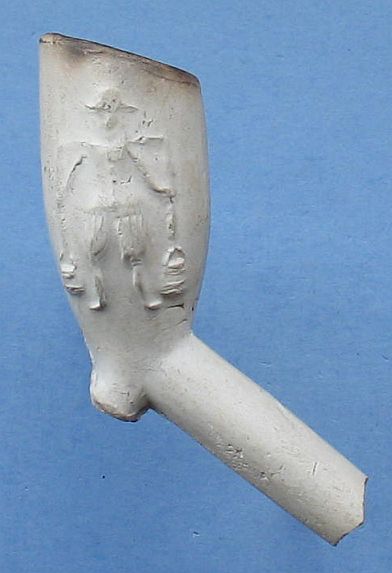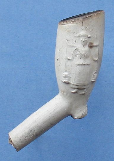 Pijpenkop: ± 1690 - 1710 Model: Trechter Vindplaats: Havezate Werkeren te Zwolle Versiering links: Melkmeid Versiering rechts: Melkman