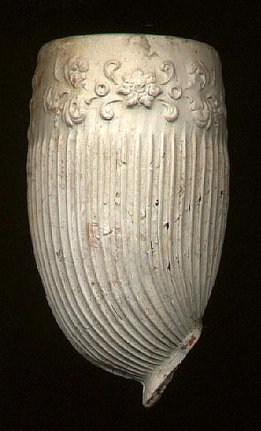 Pijpenkop: Vierde kwart 19e eeuw Vindplaats: Omgeving Gouda Model: Isabé Versiering: Ribbels met bloemversiering aan de ketelrand Schenking: Lia Schouten lid van de PKN