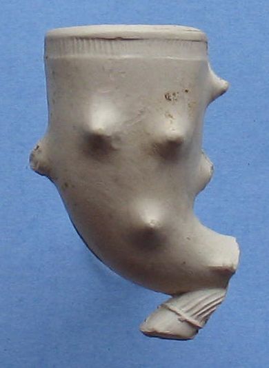 Pijpenkop: Laatste kwart 19e eeuw Vindplaats: Achterwillens Gouda Model: Fantasie Trechter met stekels en de hiel is een bokkenpoot