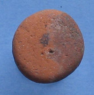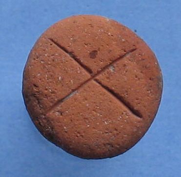 van rood aardewerk met de hand gevormde schijfjes zien aan één zijde een kruis