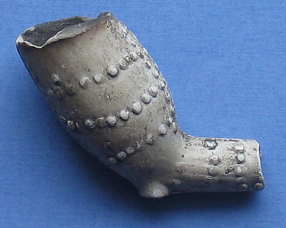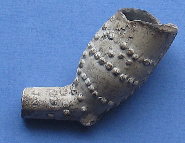 Pijpenkop: Midden 17e eeuw Vindplaats: Beerput Delft Model: Dubbelconisch Decoratie: Parelranden