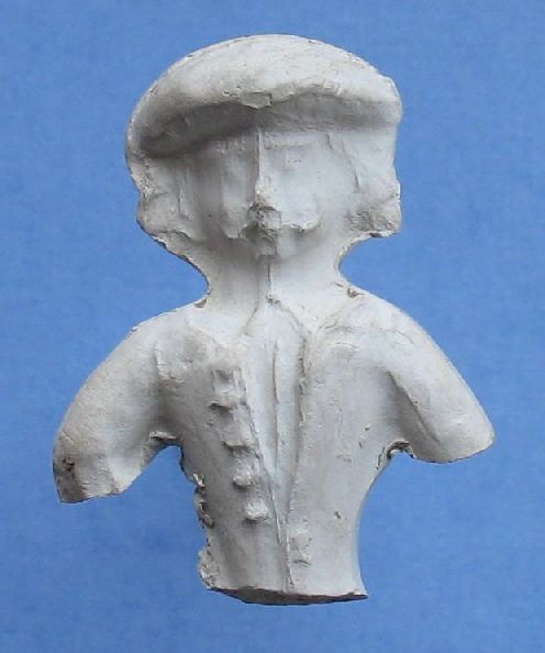 Pijpaarde beeldje: 17e - 18e eeuw Vindplaats: Arnhem Rijnoever Voorstelling: Mannetje met omhoog krullende snor Schenking: Peter Lijster Opmerking: Waarschijnlijk kinderspeelgoed