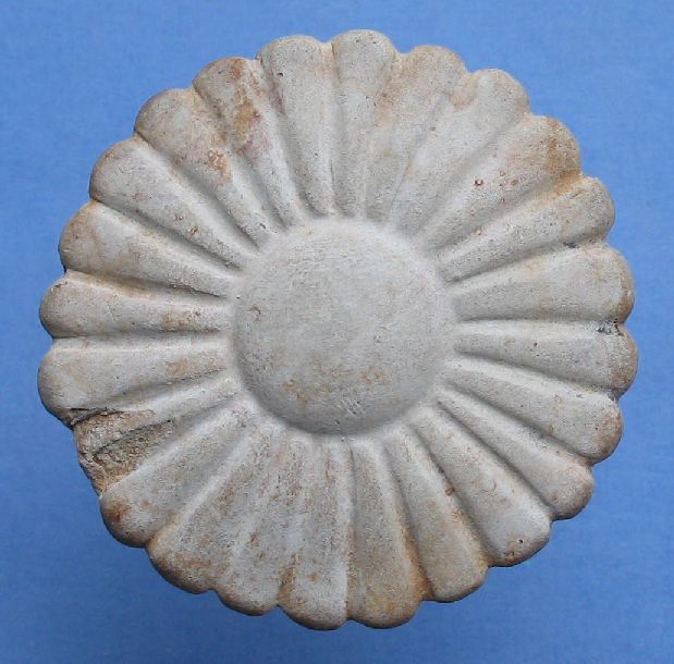 Pijpaarde: 17e 18e eeuw Vindplaats: Gouda Peperstraat Voorstelling: Bloem Opmerking: Mogelijk een patacon