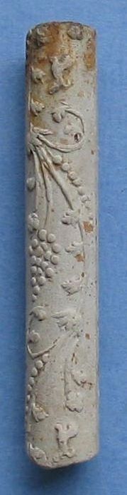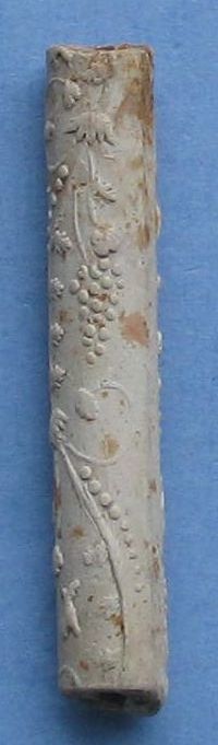 Pijpensteel: 18e eeuw ? Vindplaats: Arnhem Rijnoever Decoratie: Druivenranken en springende hondjes Schenking: Peter Lijster