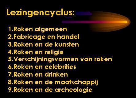 De Pijpelogische Kring, gespecialiseerd in de studie over kleipijpen heeft 9 powerpoint presentaties ontwikkeld van elk 90 slices met een duur van 2x 45 minuten. De onderwerpen vindt u in de lijst hierboven. De inhoud van de lezingen zijn op de historie gericht en houdt zich niet bezig met de voor- en tegenstanders van het roken.